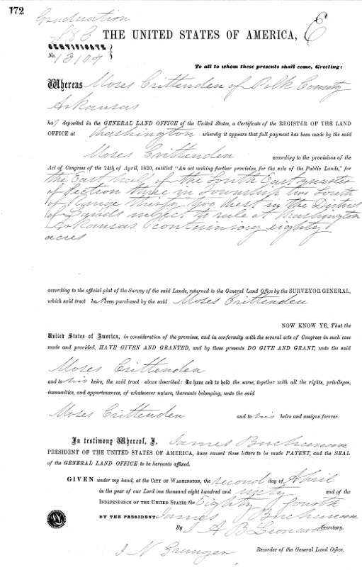 The Bureau of Land Management (BLM) Federal Land Record site includes a searchable database where I found a copy of Moses’ land patent signed by President James Buchanan.  I also found two patents for land owned by James Quinton.