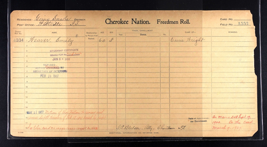 He applied as Cherokee by blood before the Dawes commission but was denied since he had been a slave of Elijah Phillips and was enrolled as freedman through his mother Emily (Crittenden) Weaver.  I am as interested in finding out more about Anthony and his descendants as I am all of my grandmother’s siblings and half siblings.  Anthony and Emily are two of the people I hope to find out more about on my next trip to Oklahoma.  I will definitely pay my respects to both by visiting the cemeteries where they are buried.