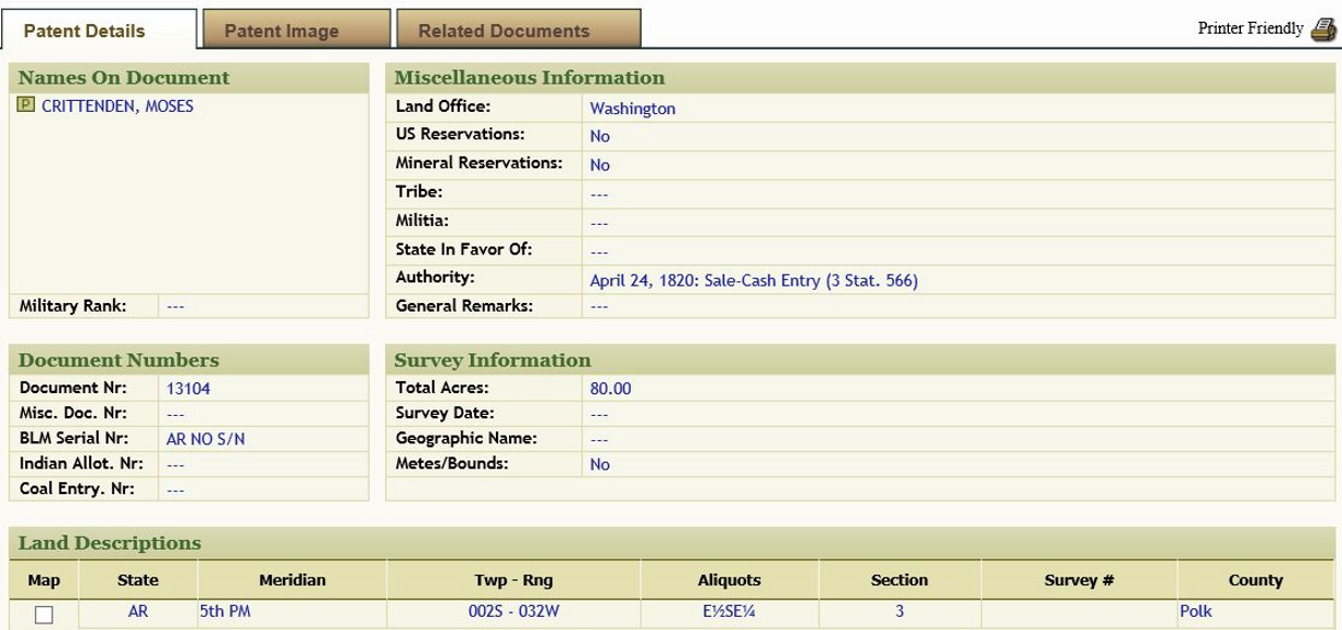 In November 2013, now knowing that Moses owned real estate in Arkansas, I started a search to try to find information on land owned by Moses Crittenden.  I accessed the following sites which eventually led me to the Bureau of Land Management (BLM) Federal Land Record site.